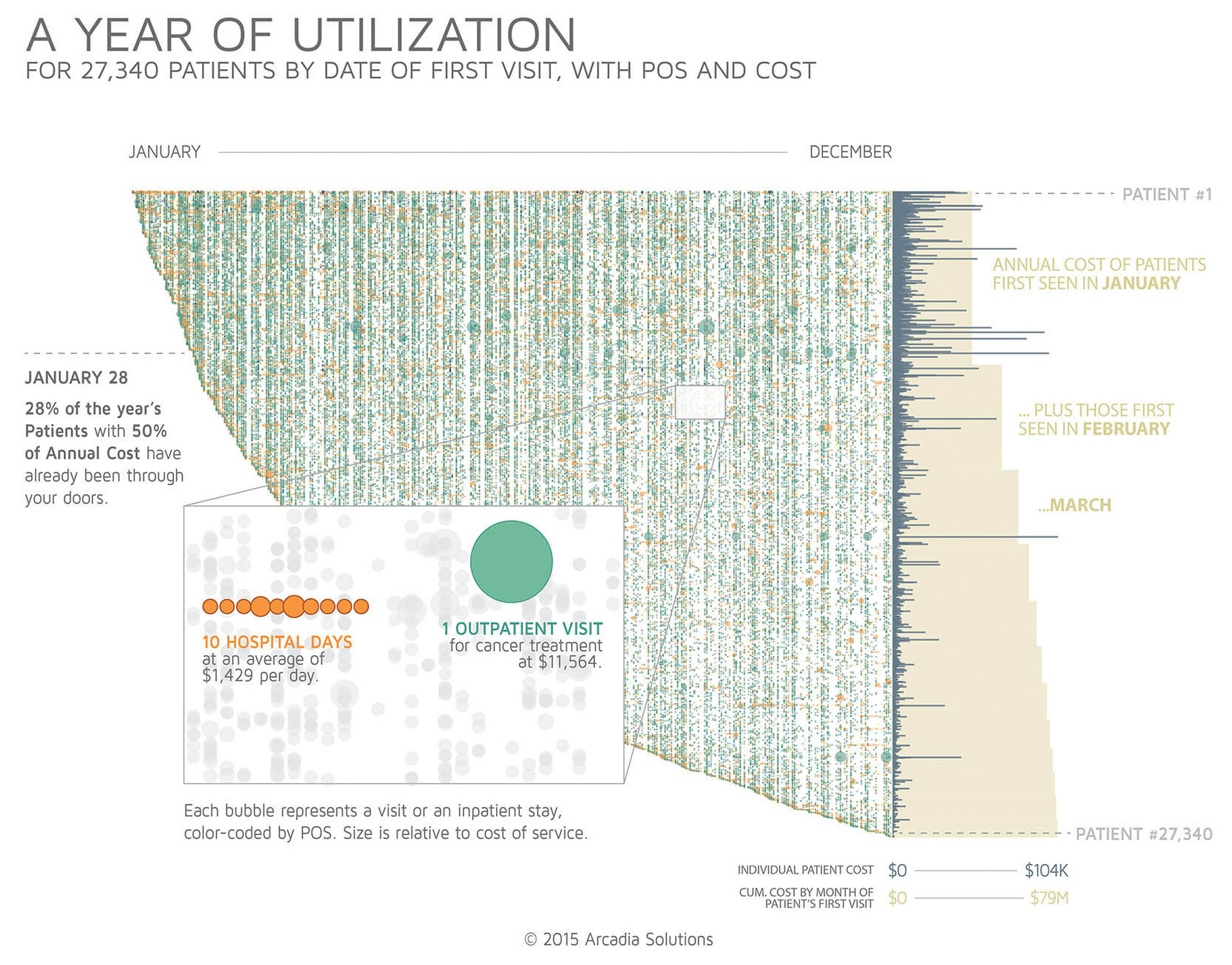 This phenomenon can also be seen by stepping back and observing the gradient of dense bubbles in the top left fading to a much sparser spread in the bottom right; meanwhile, the gray bars represent the total annual cost for each patient and the cream-colored area chard shows cumulative cost by the month of the first visit.