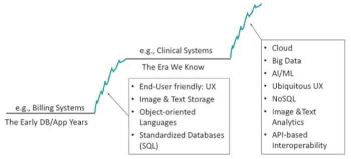 Then a number of technology breakthroughs happened – standardising on SQL databases, the storage and viewing of text and images, and perhaps most importantly, the graphical user interface. This allowed non-dedicated users, like physicians, nurses and patients, to use software to help them with their work and lives. This ushered in the next couple of decades where we built and deployed electronic medical records (EMRs).